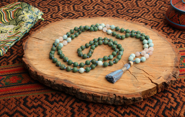 These traditional 108 prayer beads, known commonly as a mala, are used for the practice of japa, the act of repeating a mantra 108 times in prayer. They are handmade lovingly, using the traditional mala knot known as brahmagranti.