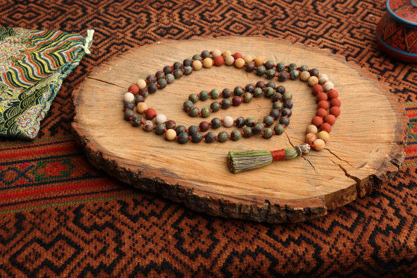 These traditional 108 prayer beads, known commonly as a mala, are used for the practice of japa, the act of repeating a mantra 108 times in prayer. They are handmade lovingly, using the traditional mala knot known as brahmagranti.