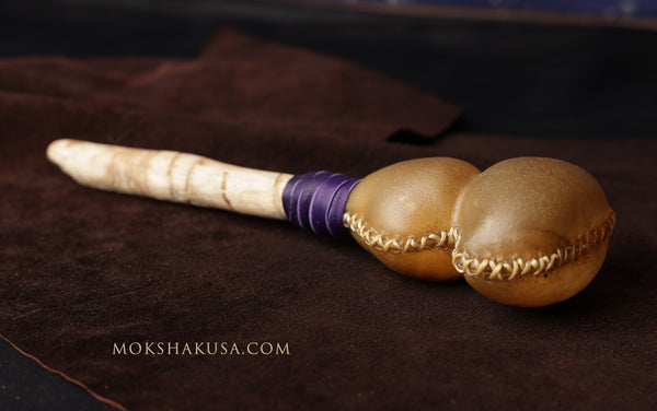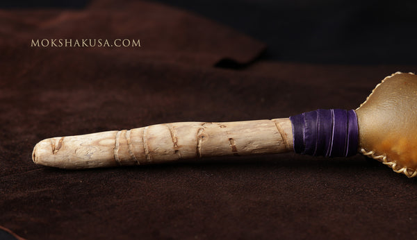 The rawhide head is made of elk. The handle is driftwood from the Oregon coast. The base of the head has a purple leather wrap.