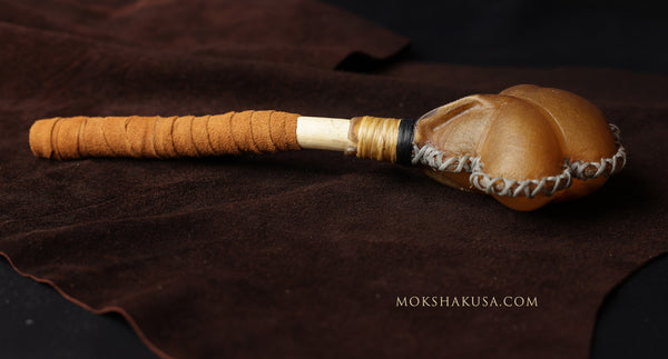 The rawhide head is made of elk. The handle is devils club harvested for medicine on Moksha's property. The handle is wrapped with leather. The head shape is a new design that was shaped while the rawhide was wet to make this very special and unique flower design,