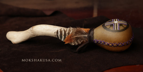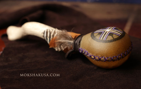 The rawhide head is made of elk. The handle is driftwood from the Oregon coast. Wrapped with leather and adorned with feathers.