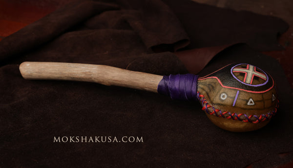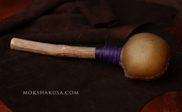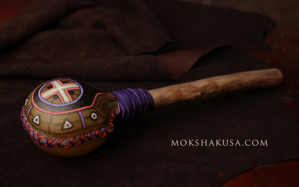 The rawhide head is made of elk. Wrapped with purple leather. Hand painted cross emblem with walnut ink and acrylic.